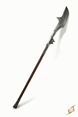 Epic Armouryrsquos Dervish Spear is a 190 cm latex weapon inspired by a primitive glaive. The spearrsquos 70 cm blade is curved and spiked to give it a vengeful look, sculpted and handpainted to appear attached to a wooden pole with leather ties. The